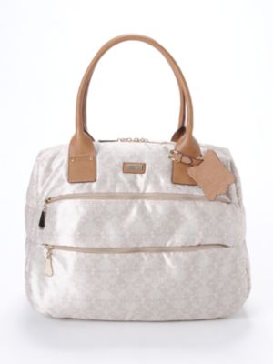 カラーはベージュ、パープル、チャの三色です。全面にファスナーポケットがついた、ボストンバックタイプです。ファスナーを開けると、大きく口がいてバックの生地もやわらかく、軽くて使いやすそう。