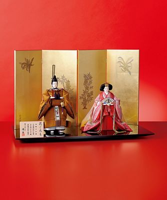 吉祥文様を施した金屏風が古式ゆかしい立雛飾り。殿の衣裳に用いた龍村美術織物の黄櫨染が格調の高さをより演出します。