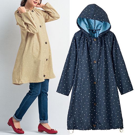 繊維1本1本に加工を施して、生地自体に撥水性を持たせた新素材「アクアスジー」。蓮の葉のような構造で水が球状になってポンポン跳ねて転げ落ちます。裏にコーティング加工も不要なため、通気性を妨げずムレにくくサラサラ。しなやかで軽い着心地のレインウェアです。(ファッショングッズ)