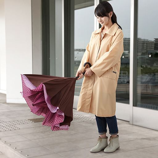 雨の日の外出で、濡れた傘の取扱について、以外に面倒。でもこの傘なら雨に濡れた表面を内側に閉じる特殊な二重構造で水滴に触れずに済みます。たたんだ後に、自立するから、屋根の下で、濡れた服やカバンをささっと拭く間にチョイ置きもできてとっても便利。ホネは露出していないので髪の毛もはさまる心配がありません。
